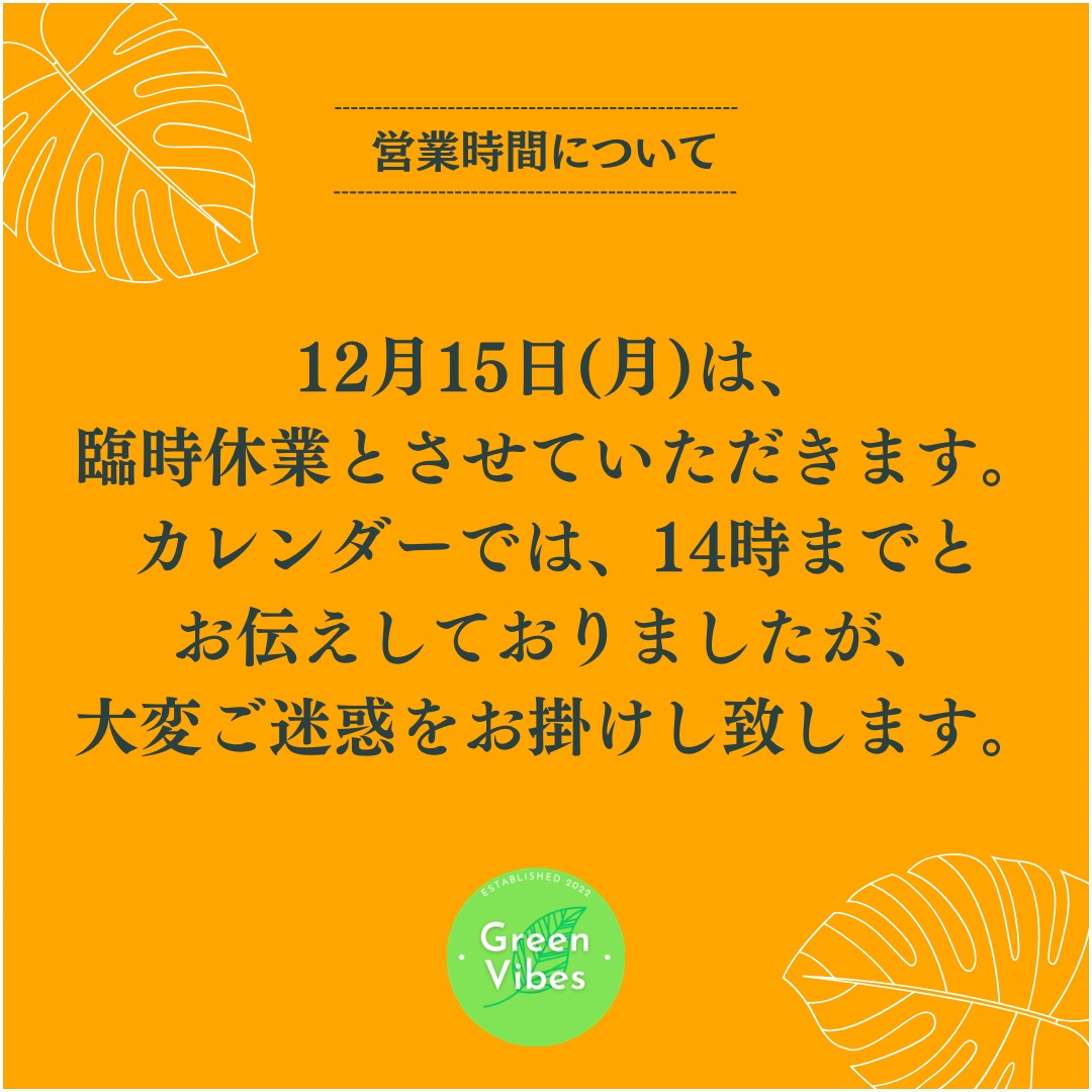 12/15(月)は、臨時休業とさせていただきます。